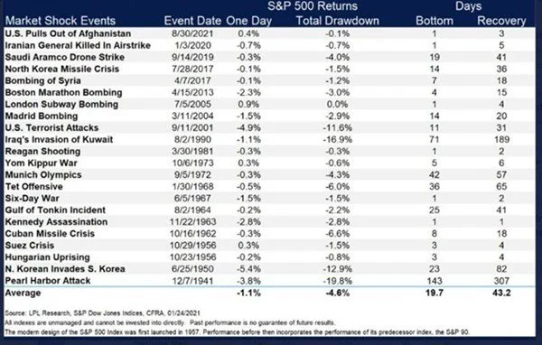 Historically, such events as we are witnessing in Europe do have an impact on portfolios but these have typically been temporary as evidenced below, which shows the impact of Market Shock Events over the past century.