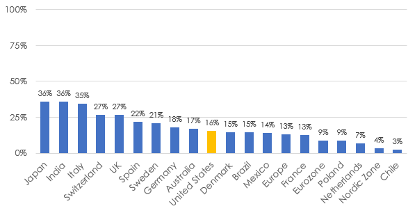 Standard and Poor’s (S&P) measure the returns of ‘active’ managers against an appropriate benchmark every year and publicly share the results. The chart below shows the percentage of these fund managers that outperform their market benchmark across several countries: